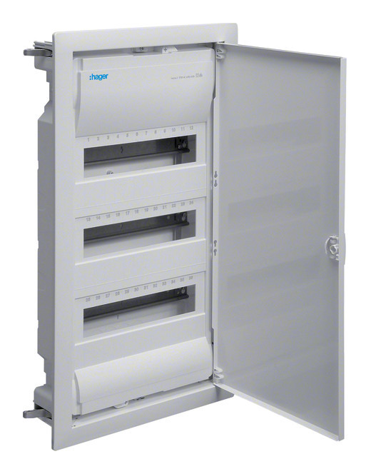 HAGER Kleinverteiler Volta, Hohlwand, 3x12 Teilungseinheiten, IP30, mit Tür bestückt nach Auswahl.