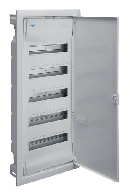 HAGER Kleinverteiler Volta, Unterputz, 5x12 Teilungseinheiten, IP30, mit Tür bestückt nach Auswahl.4 Reihen können bestückt werden, Reihe 5 bleibt leer für spätere Reserven.
